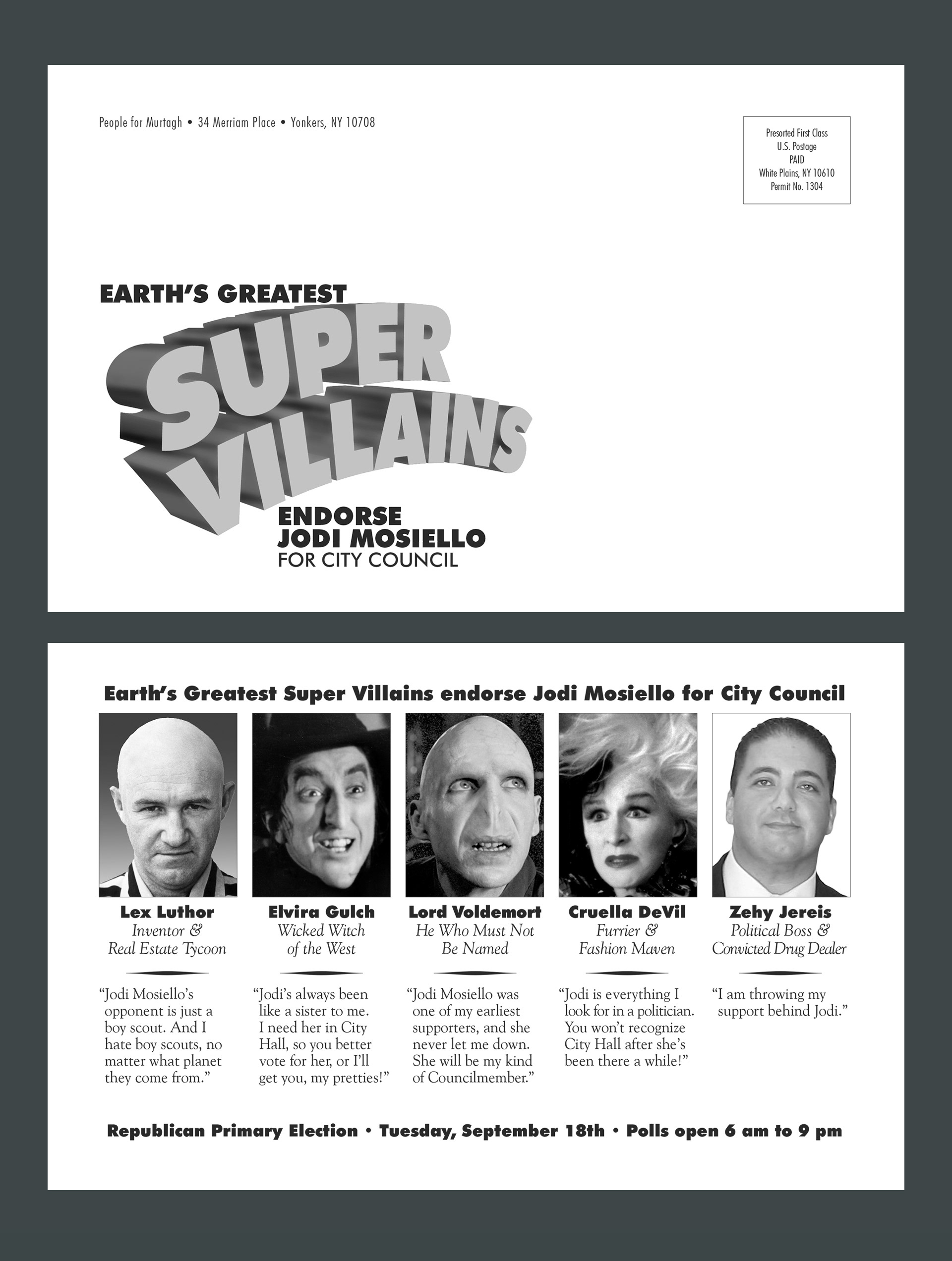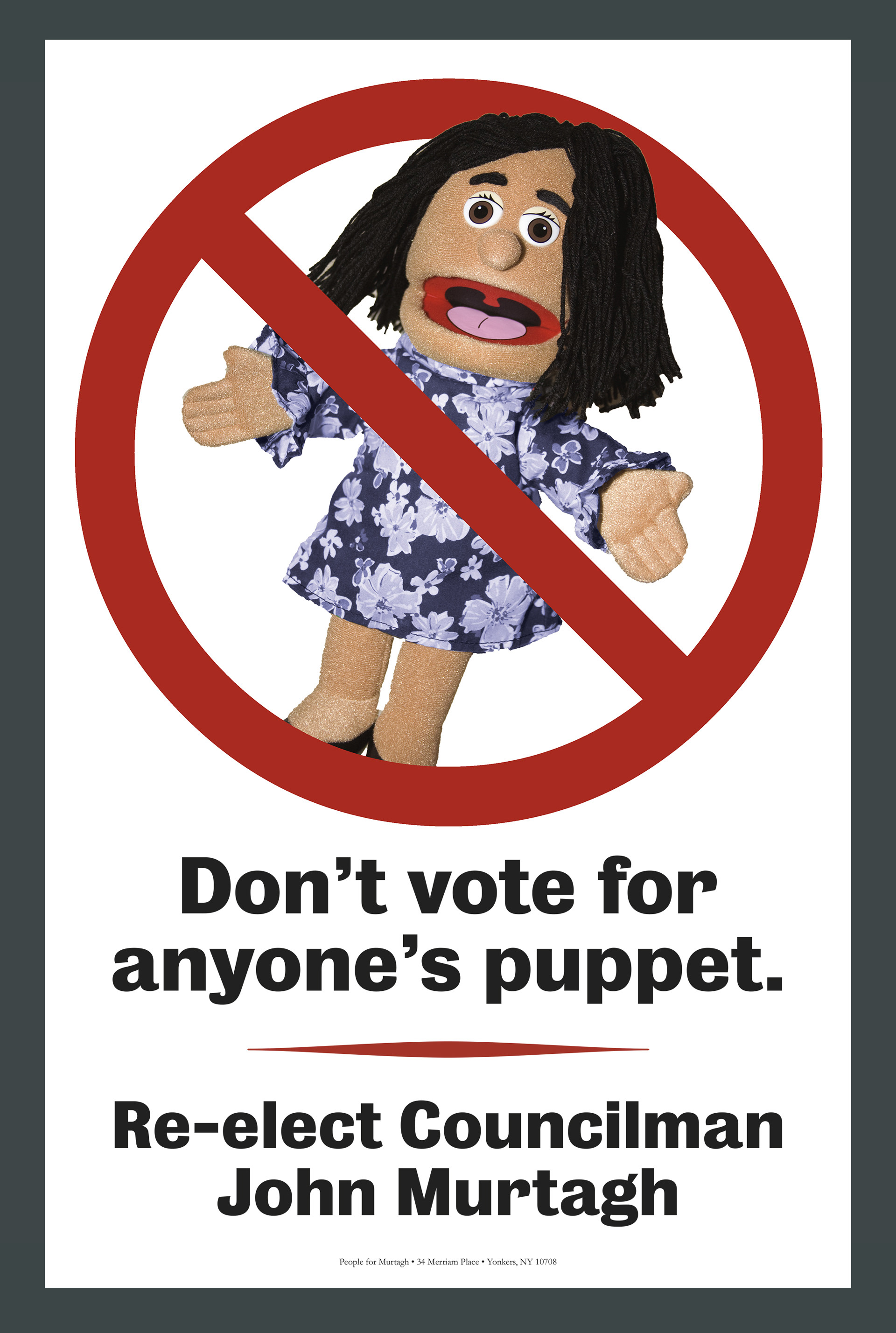 We previously mailed a piece that parodied the opposition candidate’s material by replacing her with a posed puppet in all the photos. It was so well received that we sent a followup mailer to voters, which unfolded to become this 11 x 17 poster. Seeing it appear in so many voters’ windows confirmed its appeal. Murtagh’s landslide victory confirmed its impact.